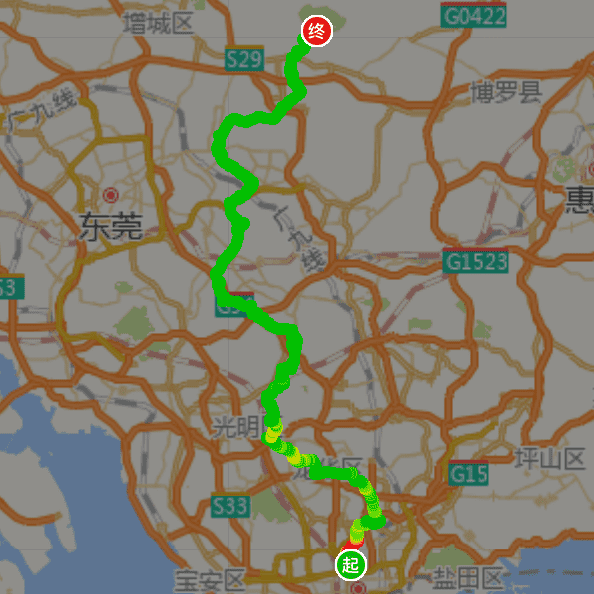 途径:银湖绿道,坂田正坑水库,南坪快速辅道,万科麓山后山(鸡公山山脉起点),布龙路,松联路,布吉三联水库,三联郊野公园,甘坑地铁站,甘坑客家小镇,甘坑河绿道,樟坑径绿道,上围艺术村,环观南路,环观南雨水花园,茜坑老村,茜坑绿道(茜坑水库),大浪绿道(火龙果基地),光明绿道(山谷清音,蝴蝶谷,禾搓涧水库),观光路