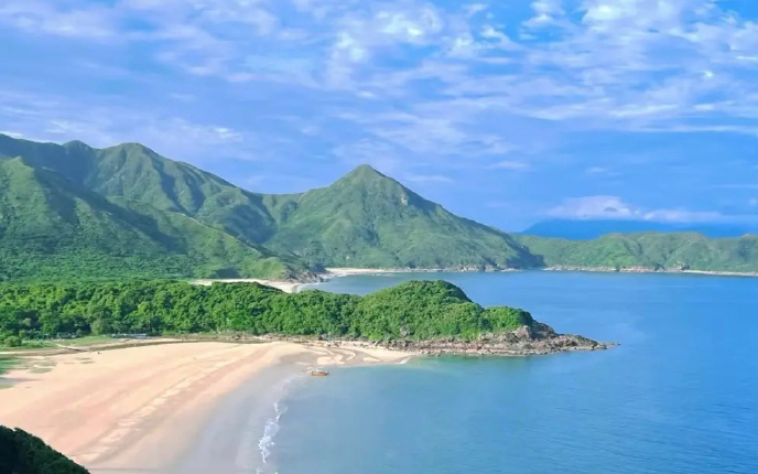 站在两湾高处远眺,山海问嵌着弦月般质地柔软的沙滩,远眺海天一色,近观碧波无痕。
