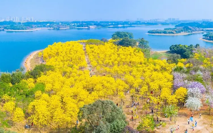 自驾松山湖骑车赏黄花风铃木、宫粉紫荆、白花紫荆和红花紫荆等花卉,观音山祈福