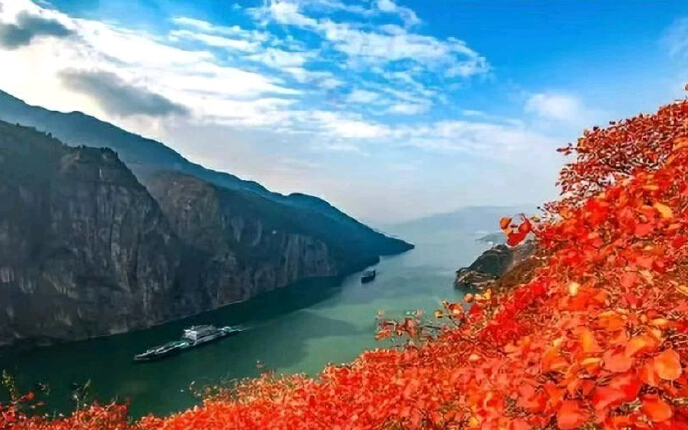 瞿塘峡全景:可俯瞰八公里长的瞿塘峡,两岸断崖壁立,江水奔腾,为长江三峡最短、最险峻的峡段。